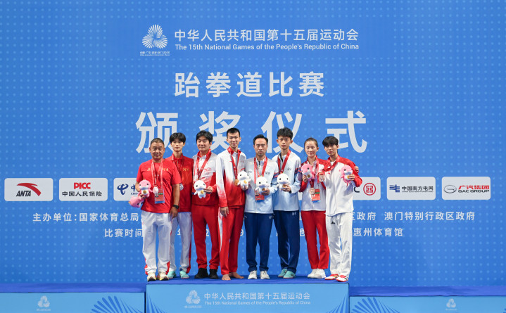 获奖选手与教练员在广东惠州举行的第十五届全运会跆拳道项目男子58公斤级决赛颁奖仪式上合影。新华社记者 肖恩楠 摄