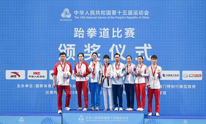 获奖选手与教练员在广东惠州举行的第十五届全运会跆拳道项目女子49公斤级决赛颁奖仪式上合影。新华社记者 肖恩楠 摄